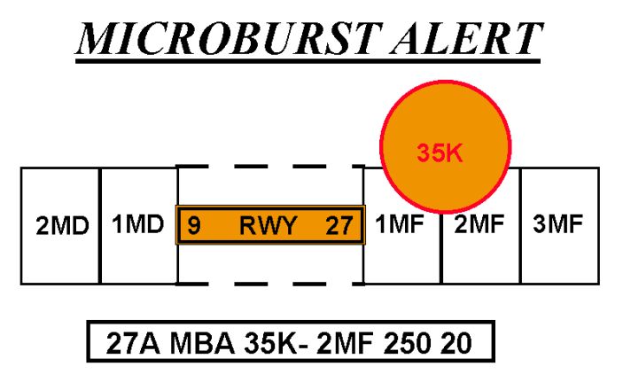 Pokud by se jednalo o upozornění na střih větru, vypadala by zpráva stejně, pouze by namísto zkratky MBA byla použita WSA (Wind Shear Alert).